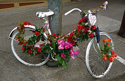 In community mourning, objects are generalized and consistent between all memorials. Though the act of placing these objects may be personal, their status at the memorial site does not identify the deceased or the mourners. The most prominent example is the ghost bike, a spray painted white bicycle, typically recovered from salvage, and created by the bicycling community rather than family. The initial creation by cycling community members embeds the initial memorial in the world of social justice. This form of mourning indicates the social power of the ghost bike memorial, where objects are used to instruct the living about the dangers of their behavior. Further examples of community mourning are advocacy signs stating ‘Cyclist struck here’ or ‘A Cyclist was Killed Here’, flowers and candles. Of these examples, flowers show the most degree of variation, typically placed around the bicycle in a traditional display, they can also be lightly or heavily wound around the spokes, crossbars and handlebars. Of the community mourning symbols flowers do the most work to redefine the crash site, creating a bridge between community and intimate mourning, changing the bike from an austere, white specter, into an object of life and beauty.